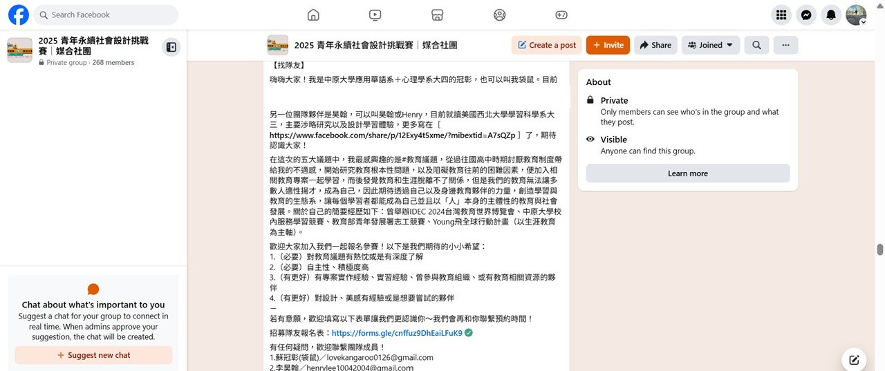 (在提案臉書社團中發布招募宣傳文/圖片來源:2025 青年永續社會設計挑戰賽|媒合社團)