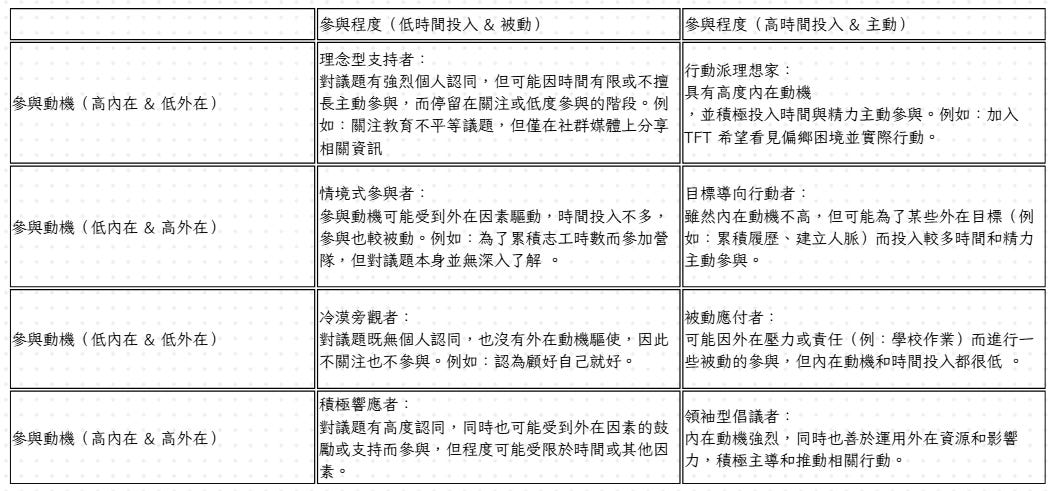 經過初步分類,我們發現,大學生對於教育平權的態度與實際參與,並非僅止於「關心與否」的二分法。許多人雖然口頭上表達認同,行動上卻裹足不前。 我們曾試圖將這些差異進一步類型化,初步整理出八種類型的參與者輪廓,這在自我辨識與內部理解上確實帶來幫助,例如像是我自己可以判斷出自己可能屬於「行動派理想家」或「領袖型倡議者」;然而,當這些分類用來對外溝通時,卻顯得過於複雜,反而難以傳達我們真正想訴說的痛點。