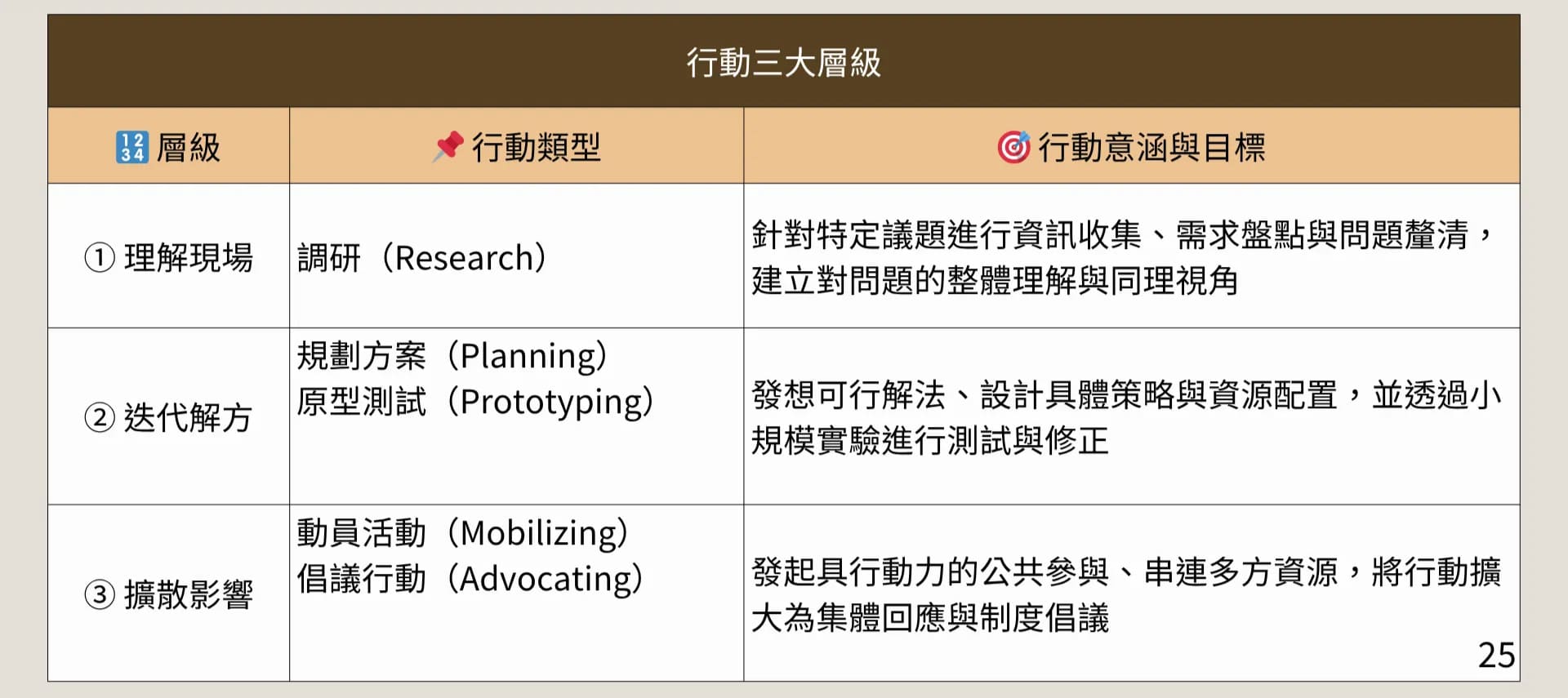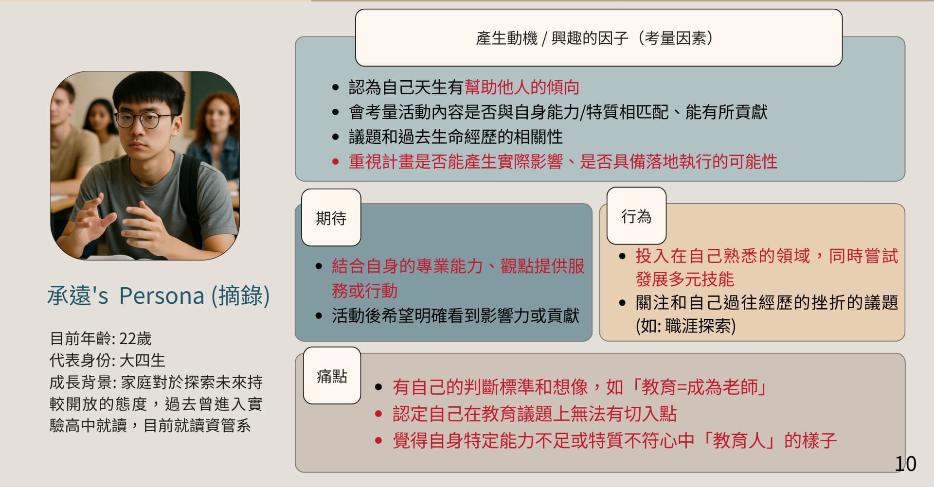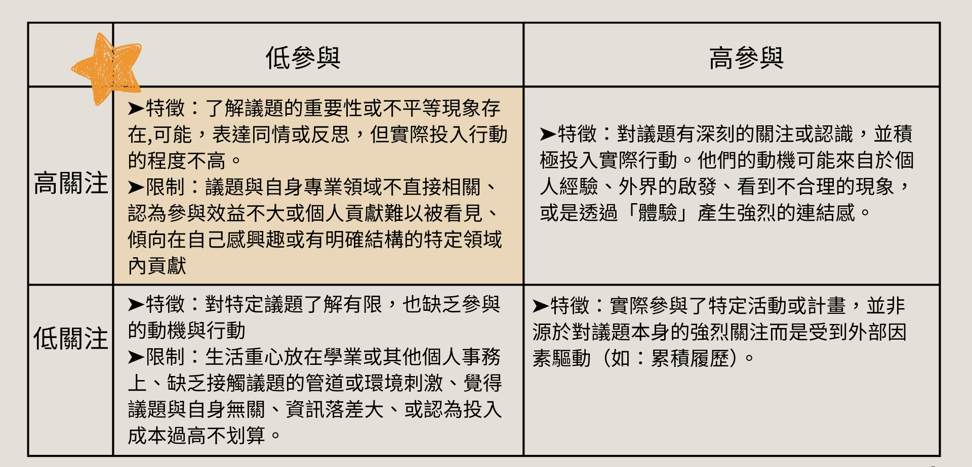 這群人就是我們後來選定的目標族群:「高關注 × 低參與」的大學生。他們並非冷漠,也不是真的無力,而是常常卡在不知道從哪裡開始,不知道自己能做什麼。