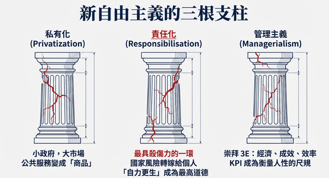 舉例來說:當政府推動「自力更生」的福利政策時,這就是「責任化」的體現。如果你生活困頓,新自由主義傾向於認為是你個人的「競爭力不足」或「不夠努力」,而非社會結構出了問題。