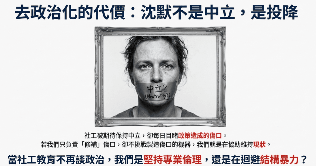 也許,真正需要被重新思考的,不只是「社工能不能談政治」,而是:如果社會工作不再談政治,我們究竟還剩下什麼?