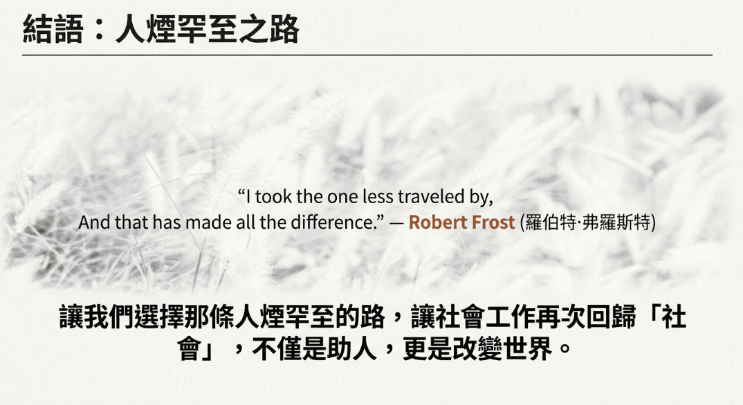 如果社會工作只被允許停留在微觀處遇與個人改變,而被剝奪對制度、政策與權力結構的提問能力,那麼專業是否仍忠於其初衷?這正是「去政治化」最深層、也最值得警惕的後果。