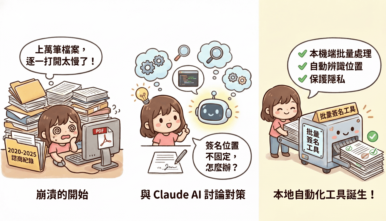 有些在第一頁,有些在第二頁,甚至格式略有差異,無法單純用「固定頁數」處理。也因此,我開始研究是否能有一種方式,讓系統自動判斷簽名欄位的位置,並正確地將電子簽名加上去。在這個過程中,我開始與 Claude AI 討論可能的解法,也逐漸整理出一條可行的處理流程,於是便有了這篇紀錄文。