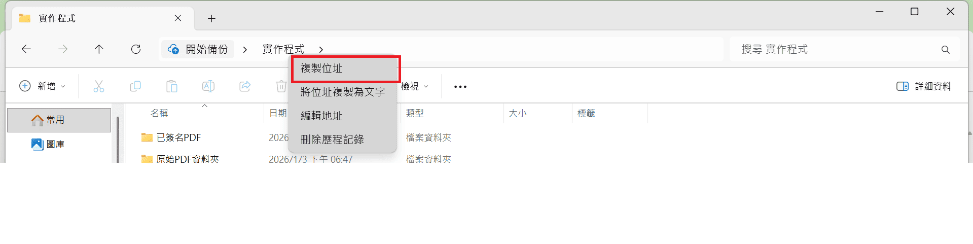 如果不想要那麼麻煩去找他在哪,可以點選資料夾上排,按右鍵「複製位置」即可找到資料夾在那了。