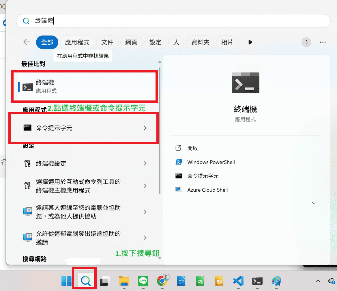 4.驗證安裝是否成功:Window系統開啟「命令提示字元」或「終端機」(可直接在電腦搜尋)